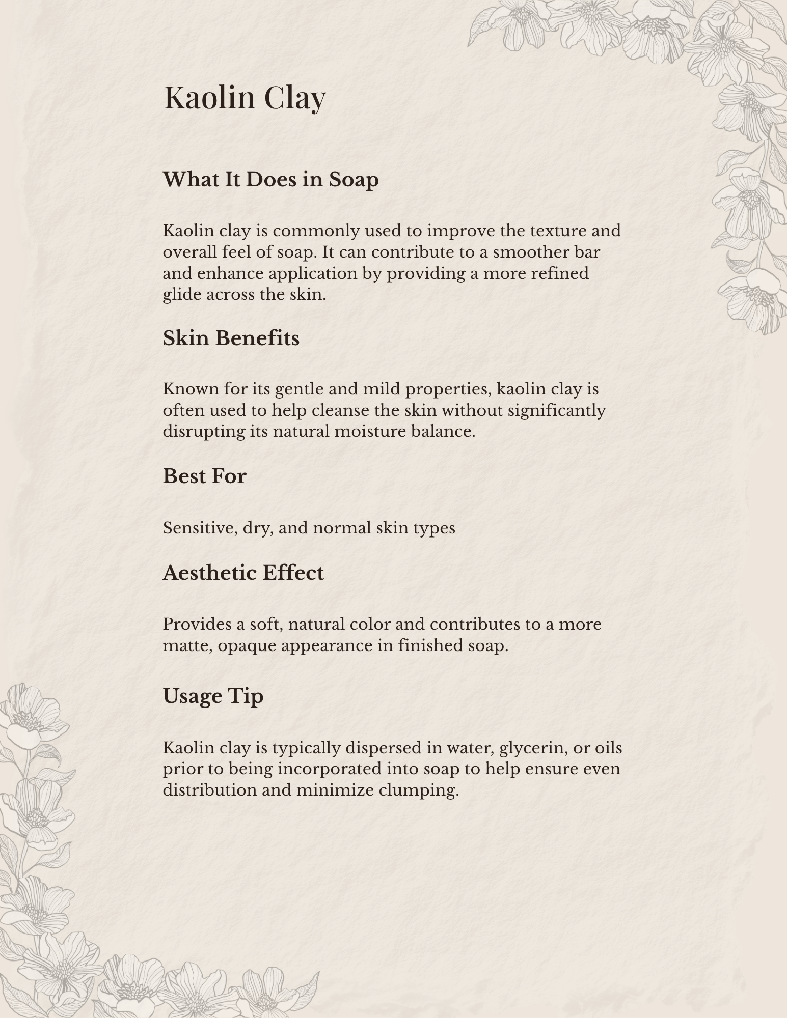 A simple, thoughtfully designed guide to understanding natural soap ingredients, including clays, botanicals, and more.